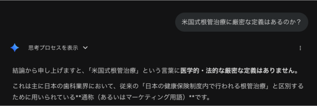 そもそもAIが言っているような内容(ラバー、マイクロ使ってます的な内容)を歯科医師側も本気で定義だと思っていて、某有名な先生方の経緯を全く知らない歯科医院が悪意もなく「米国式根管治療」を書いているところもたくさんあると思います。